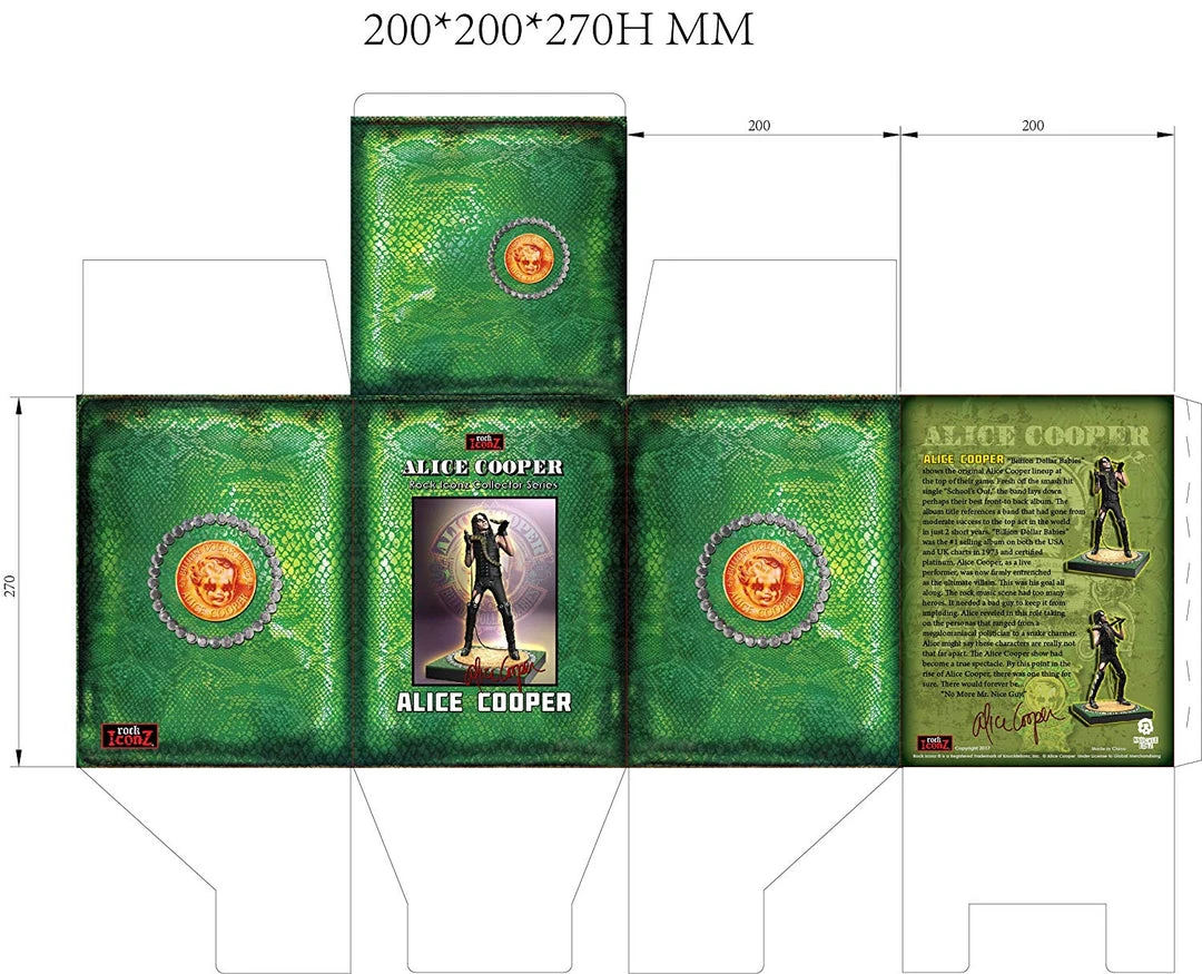 Alice Cooper is dressed in all black with a microphone while gazing into the eyes of his green boa constrictor. The Alice Cooper II Snake Rock Iconz Statue stands about 9-inches tall and is made of polyresin. The statue is hand-painted in tremendous detail by a team of highly skilled artists, creating a remarkable likeness to Alice.