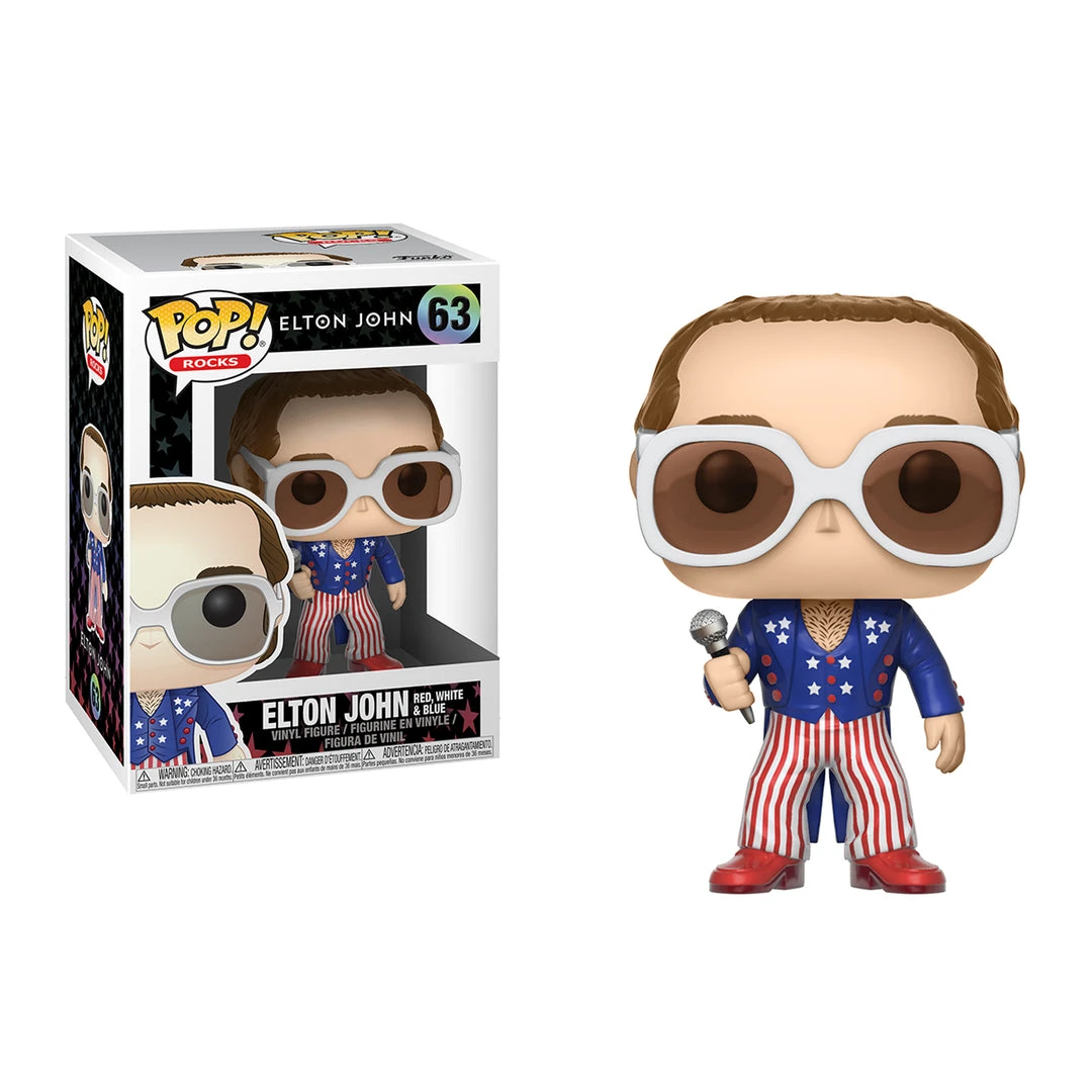 The living legend Elton John, known for his fashionable taste and larger than life outfits, is given a makeover to his Red, White & Blue suit and white sunglasses. This Pop! features Elton wearing his patriotic red, white and blue jumpsuit, looking as patriotic as he is talented.