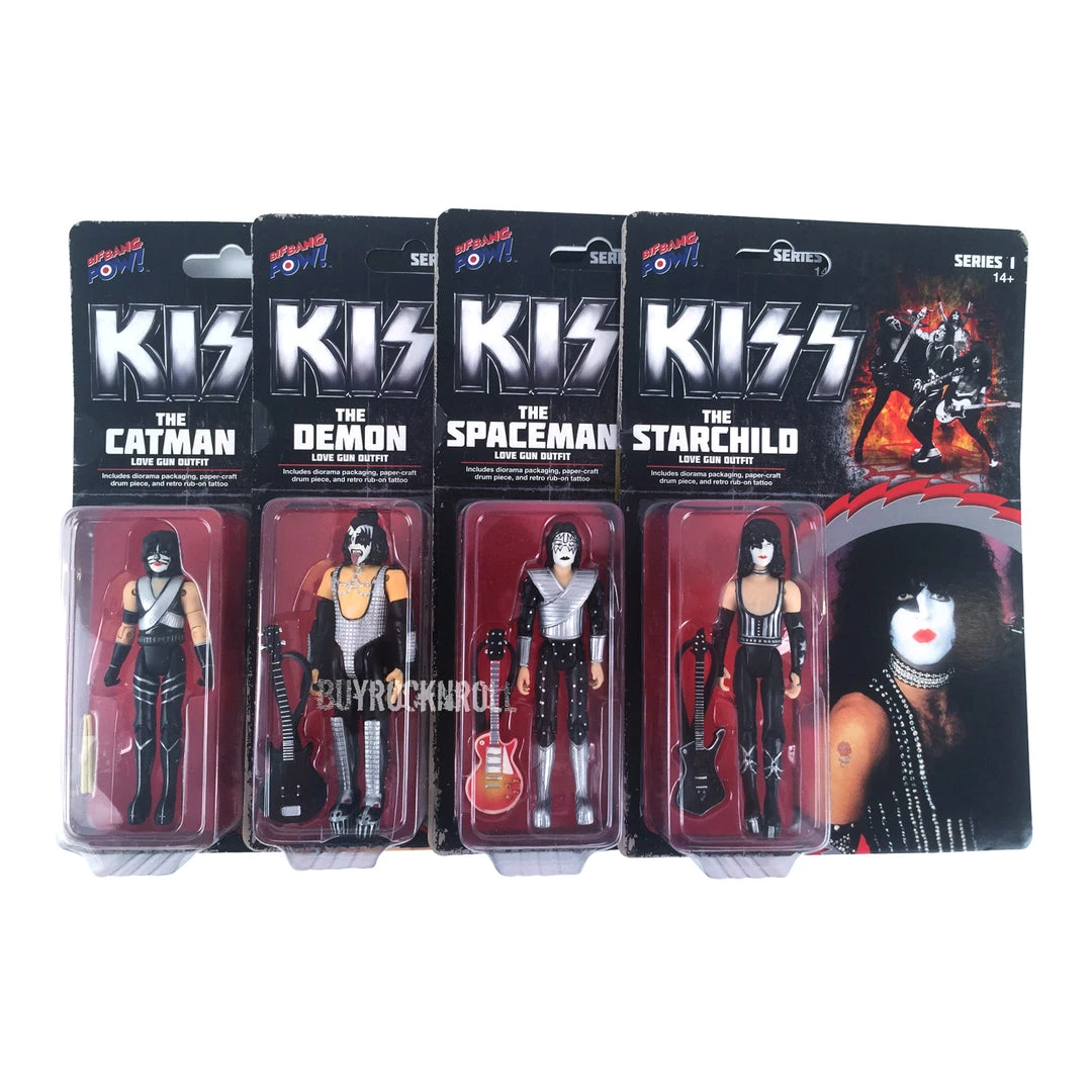 KISS Love Gun The Starchild 3 3/4-Inch Action Figure Series 1 feature character-specific clothing and accessories distinct to the band member from the Love Gun album. This exceptionally detailed figure features 11 points of articulation, includes a guitar, character-specific temporary tattoos, and comes in full-color packaging with a fold-out diorama.
