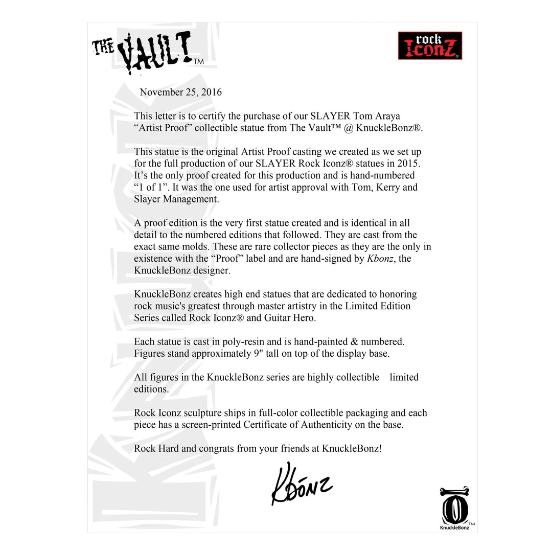 This statue is the original Artist Proof casting created as KnuckleBonz set up for the full production of the Slayer Rock Iconz® statues in 2015. A proof edition is the very first statue created and is identical in all detail to the numbered editions that followed. They are cast from the exact same molds. These are rare collector pieces as they are the only in existence with the “Proof” label and are hand-signed by Kbonz, the KnuckleBonz designer. KnuckleBonz creates hi-end statues that feature the most highly influential artists in rock music.
