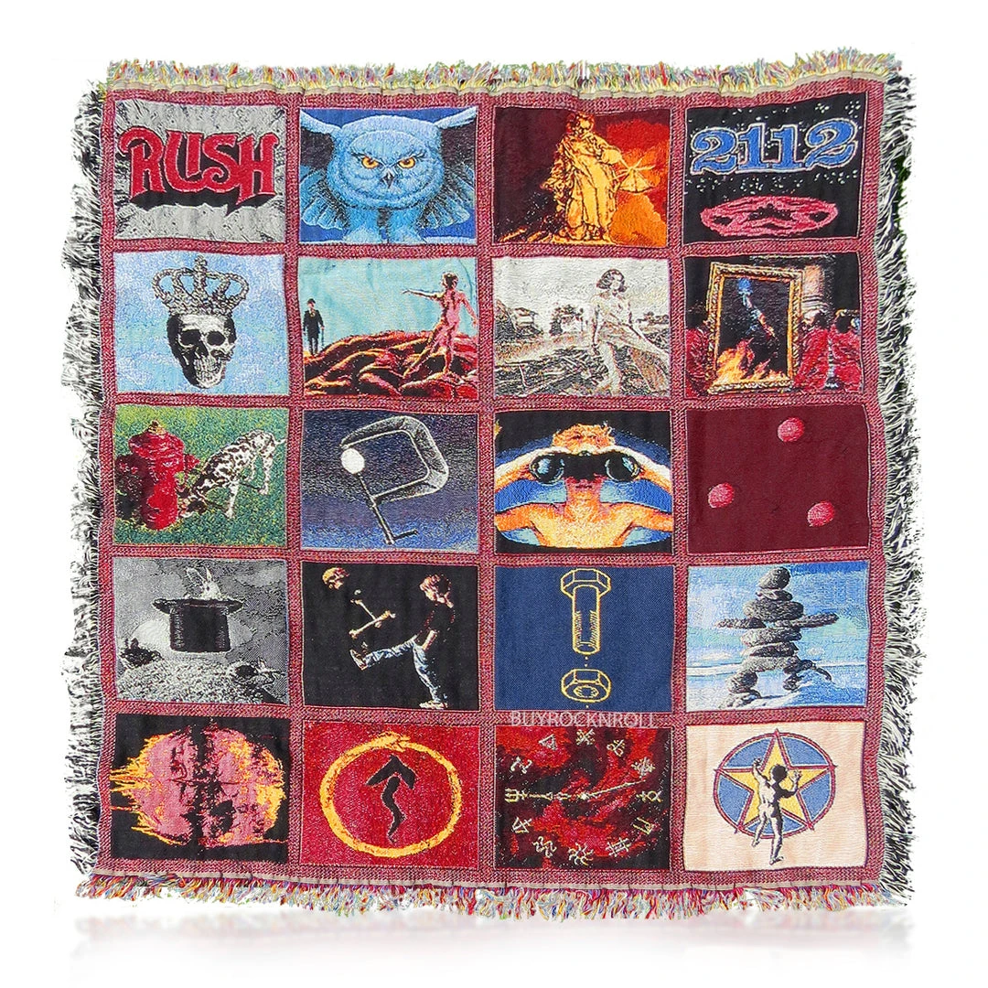 Whether you want to hit the beach, have a picnic, cozy up on the sofa, or decorate a wall, this woven Rush blanket is a really fun piece. Made in the USA, there are 20 different Rush logos woven right into the cotton fabric. The size of this blanket is 50″ x 60″. Rush, only a few in stock.