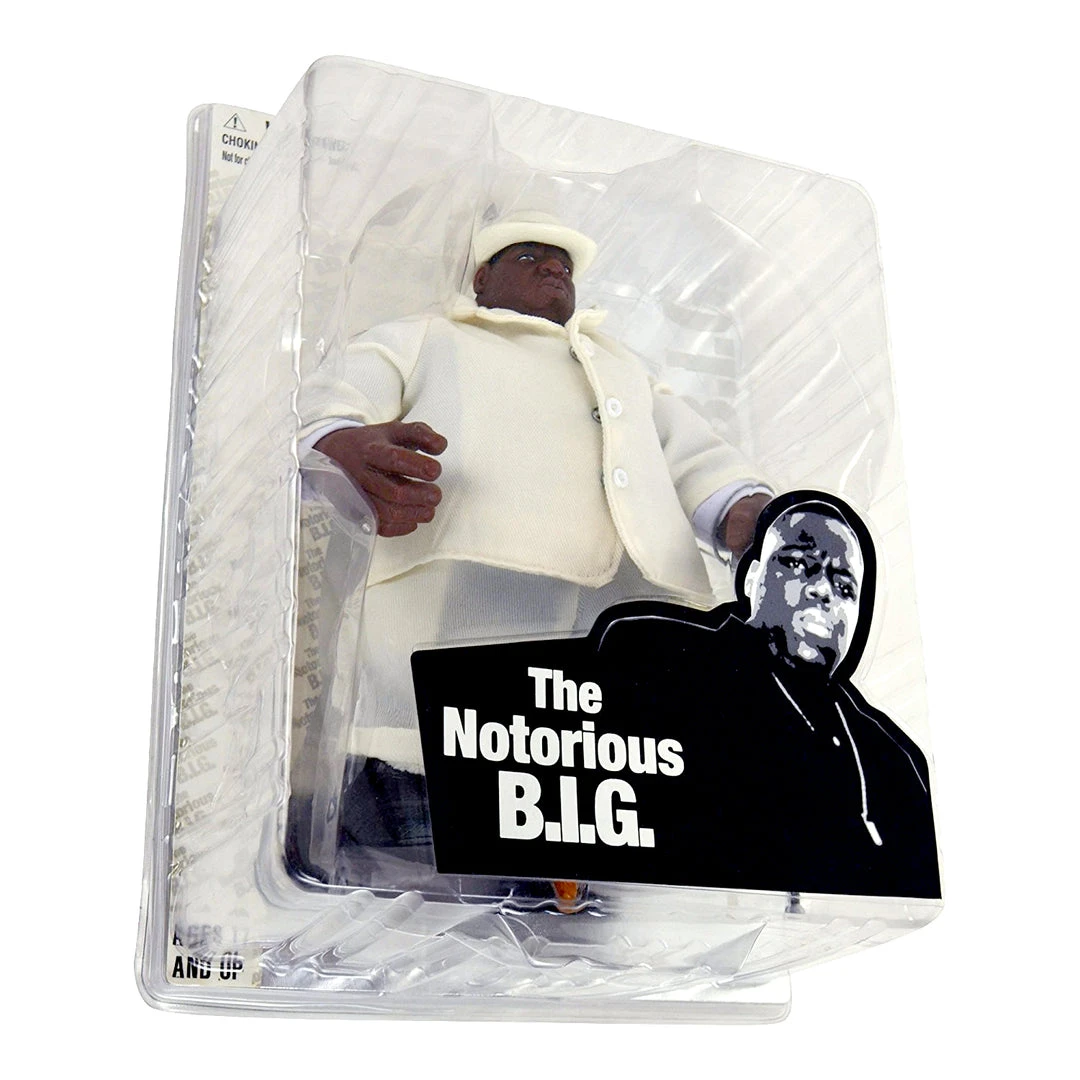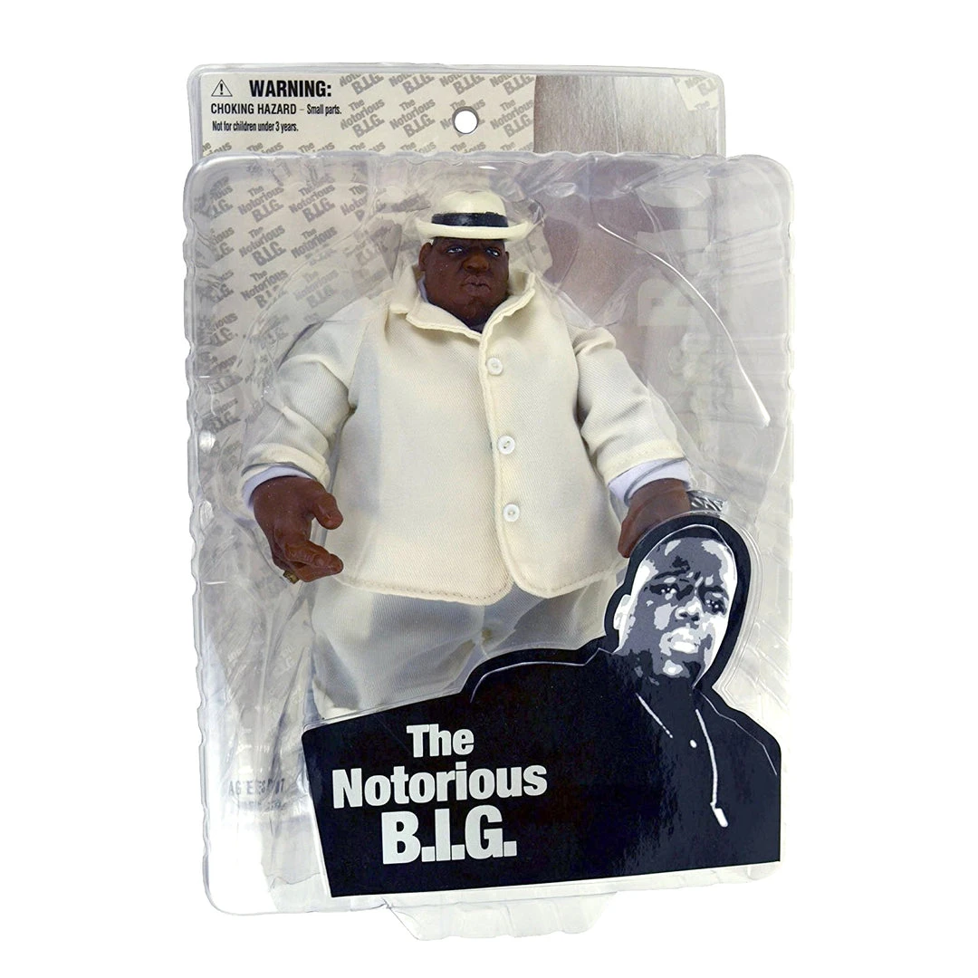 This is the first Notorious B.I.G. figure ever available at retail. Biggie sports his iconic white tailored cloth suit and comes complete with hat and cane accessories.